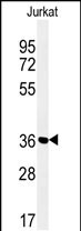 Western blot analysis of MFRN2 Antibody (N-term) (Cat. #P33511) in Jurkat cell line lysates (35ug/lane).MFRN2 (arrow) was detected using the purified Pab. |
