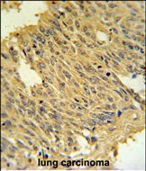 MFRN2 Antibody (N-term) (Cat. #P33511) IHC analysis in formalin fixed and paraffin embedded human lung carcinoma followed by peroxidase conjugation of the secondary antibody and DAB staining. This data demonstrates the use of the MFRN2 Antibody (N-term) for immunohistochemistry. Clinical relevance has not been evaluated. |