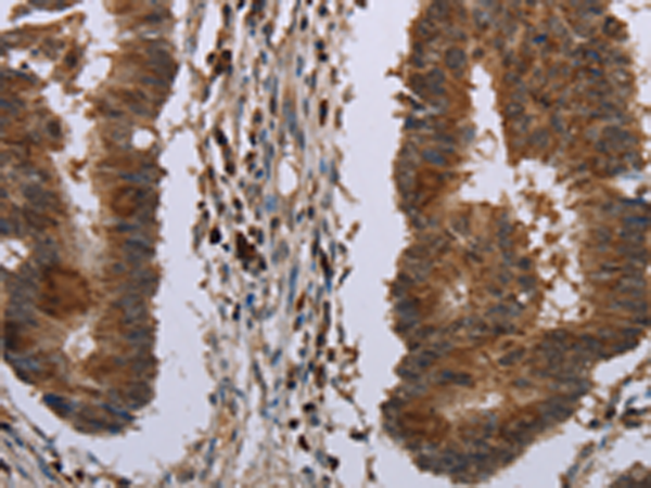 The image is immunohistochemistry of paraffin-embedded Human colon cancer tissue using P11945(MIG7 Antibody) at dilution 1/20. (Original magnification: ×200) |
