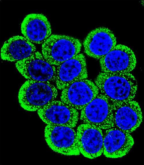 Confocal immunofluorescent analysis of MMP13 Antibody (Center)(Cat#P31328) with Hela cell followed by Alexa Fluor 488-conjugated goat anti-rabbit lgG (green). DAPI was used to stain the cell nuclear (blue). |