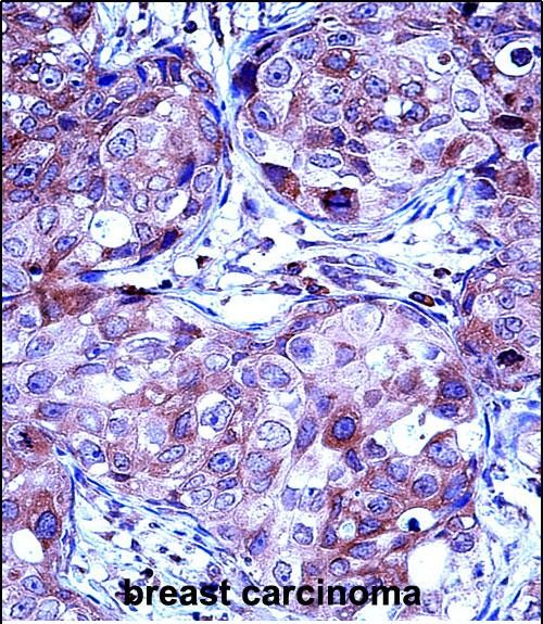 MMP13 Antibody (Center) (Cat. #P31328)immunohistochemistry analysis in formalin fixed and paraffin embedded human breast carcinoma followed by peroxidase conjugation of the secondary antibody and DAB staining.This data demonstrates the use of MMP13 Antibody (Center) for immunohistochemistry. Clinical relevance has not been evaluated. |