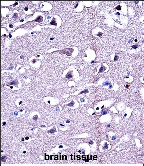 MMP16 Antibody (C-term) (Cat. #P31329)immunohistochemistry analysis in formalin fixed and paraffin embedded human brain tissue followed by peroxidase conjugation of the secondary antibody and DAB staining.This data demonstrates the use of MMP16 Antibody (C-term) for immunohistochemistry. Clinical relevance has not been evaluated. |