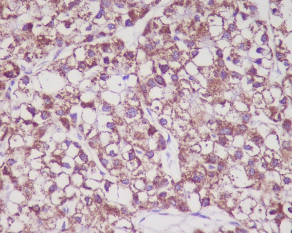 Immunohistochemistry analysis of paraffin-embedded Human liver cancer using MMP3 antibody.High-pressure and temperature Sodium Citrate pH 6.0 was used for antigen retrieval. |