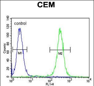 MNDA Antibody (N-term) (Cat. #P30932) flow cytometric analysis of CEM cells (right histogram) compared to a negative control cell (left histogram).FITC-conjugated goat-anti-rabbit secondary antibodies were used for the analysis. |