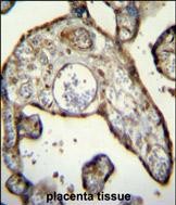 MNDA Antibody (N-term) (Cat. #P30932)immunohistochemistry analysis in formalin fixed and paraffin embedded human placenta tissue followed by peroxidase conjugation of the secondary antibody and DAB staining.This data demonstrates the use of MNDA Antibody (N-term) for immunohistochemistry. Clinical relevance has not been evaluated. |