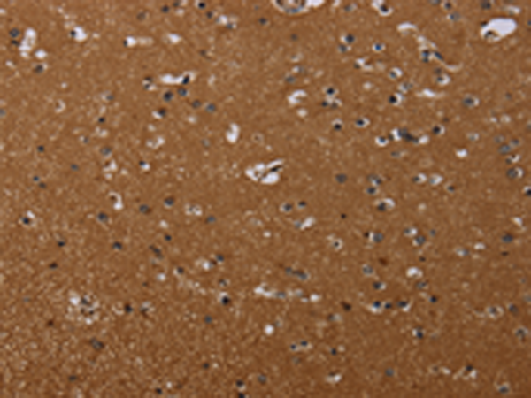 The image is immunohistochemistry of paraffin-embedded Human brain tissue using P05063(MOB1A Antibody) at dilution 1/20. (Original magnification: ×200) |