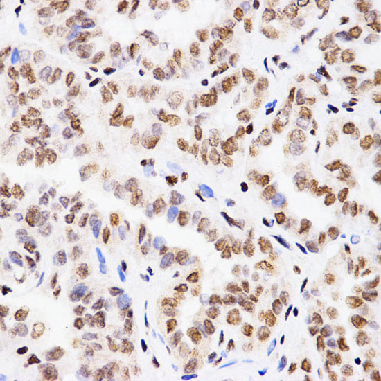 Immunohistochemistry analysis of paraffin-embedded Human thyroid cancer using MonoMethyl-Histone H3-K4 antibody.High-pressure and temperature Sodium Citrate pH 6.0 was used for antigen retrieval. |