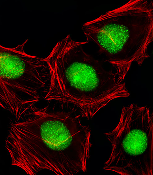 Fluorescent image of Hela cells stained with Mouse Actl6a Antibody (C-term)(Cat#P32801). P32801 was diluted at 1:25 dilution. An Alexa Fluor 488-conjugated goat anti-rabbit lgG at 1:400 dilution was used as the secondary antibody (green). Cytoplasmic actin was counterstained with Alexa Fluor® 555 conjugated with Phalloidin (red). |