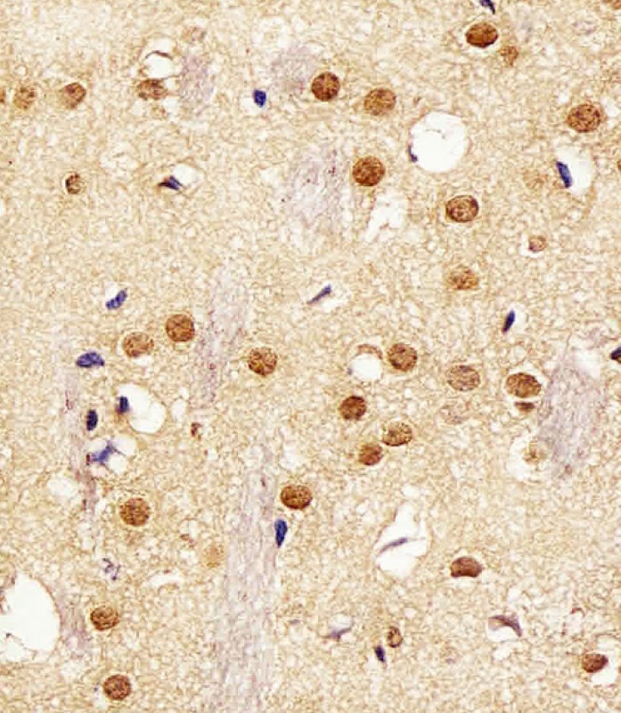 Immunohistochemical analysis of paraffin-embedded M. brain section using Mouse Actl6a Antibody (C-term)(Cat#P32836). P32836 was diluted at 1:25 dilution. A undiluted biotinylated goat polyvalent antibody was used as the secondary, followed by DAB staining. |