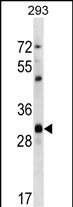 Mouse Cdk1 Antibody (C-term) (Cat. #P32661) western blot analysis in 293 cell line lysates (35ug/lane).This demonstrates the Cdk1 antibody detected the Cdk1 protein (arrow). |