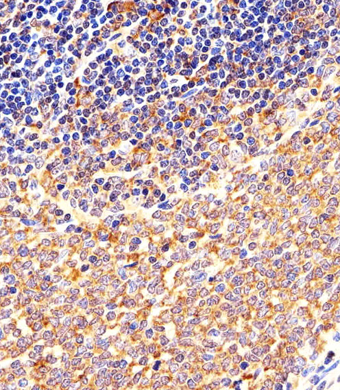 Immunohistochemical analysis of paraffin-embedded M.spleen section using Mouse Csk Antibody (N-term)(Cat#P32731). P32731 was diluted at 1:25 dilution. A peroxidase-conjugated goat anti-rabbit IgG at 1:400 dilution was used as the secondary antibody, followed by DAB staining. |
