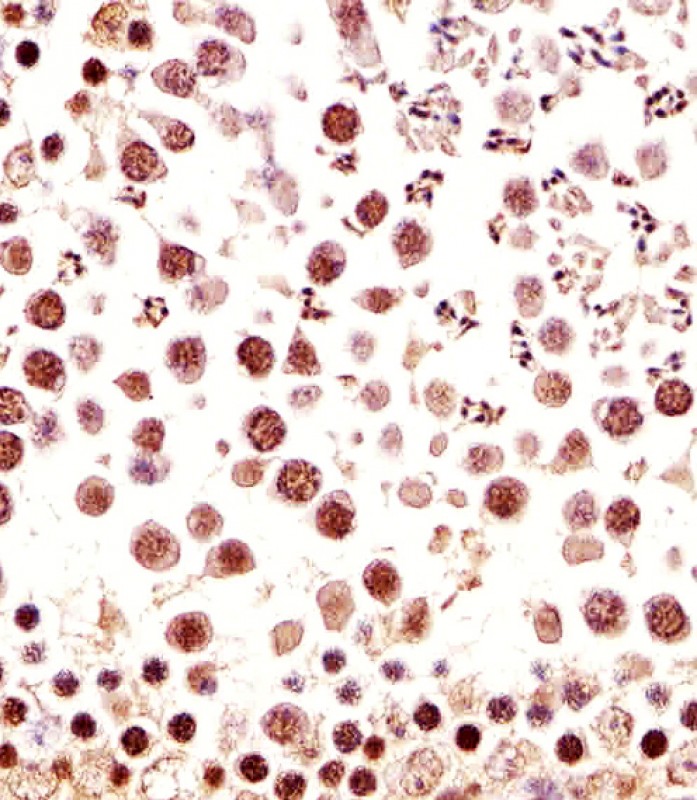 Immunohistochemical analysis of paraffin-embedded M. testis section using Mouse Ctr9 Antibody (C-term)(Cat#P32916). P32916 was diluted at 1:25 dilution. A undiluted biotinylated goat polyvalent antibody was used as the secondary, followed by DAB staining. |