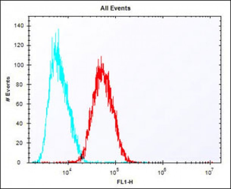 Overlay histogram showing HepG2 cells stained with P32953 (red line). The cells were fixed with 2% paraformaldehyde (10 min) and then permeabilized with 90% methanol for 10 min. The cells were then icubated in 2% bovine serum albumin to block non-specific protein-protein interactions followed by the antibody (P32953, 1:25 dilution) for 60 min at 37ºC. The secondary antibody used was Alexa Fluor® 488 goat anti-rabbit lgG (H+L) (1583138) at 1/400 dilution for 40 min at 37ºC. Isotype control antibody (blue line) was rabbit IgG1 (1μg/1×10^6 cells) used under the same conditions. Acquisition of >10, 000 events was performed. |