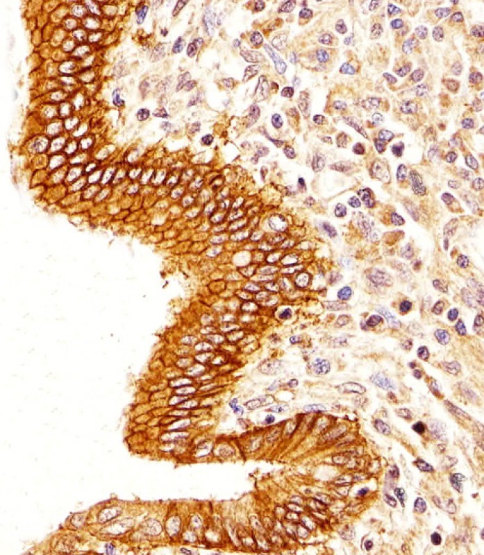 P32953 staining Epcam in Mouse colon tissue sections by Immunohistochemistry (IHC-P – paraformaldehyde-fixed, paraffin-embedded sections). Tissue was fixed with formaldehyde and blocked with 3% BSA for 0. 5 hour at room temperature; antigen retrieval was by heat mediation with a citrate buffer (pH6). Samples were incubated with primary antibody (1/25) for 1 hours at 37°C. A undiluted biotinylated goat polyvalent antibody was used as the secondary antibody. |