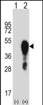 Western blot analysis of Hoxa1 (arrow) using rabbit polyclonal Mouse Hoxa1 Antibody (Center) (Cat. #P32639). 293 cell lysates (2 ug/lane) either nontransfected (Lane 1) or transiently transfected (Lane 2) with the Hoxa1 gene. |