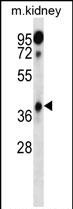 Mouse Hoxa1 Antibody (Center) (Cat. #P32639) western blot analysis in mouse kidney tissue lysates (35ug/lane).This demonstrates the Hoxa1 antibody detected the Hoxa1 protein (arrow). |