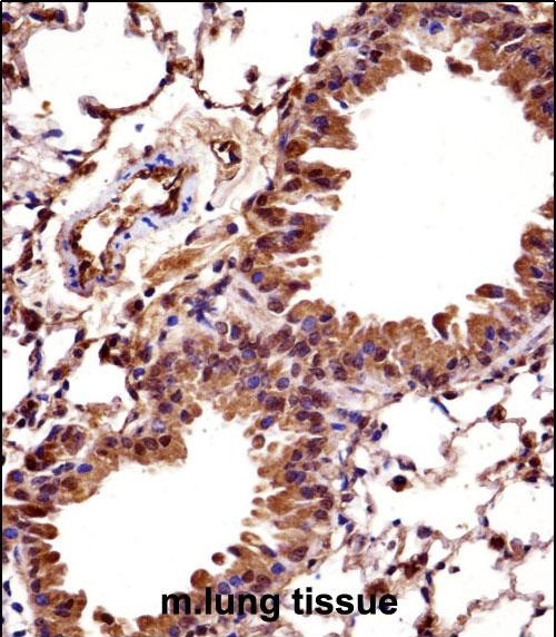 Mouse Hoxc10 Antibody (C-term) (P32659)immunohistochemistry analysis in formalin fixed and paraffin embedded mouse lung tissue followed by peroxidase conjugation of the secondary antibody and DAB staining.This data demonstrates the use of Mouse Hoxc10 Antibody (C-term) for immunohistochemistry. Clinical relevance has not been evaluated. |