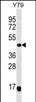 Mouse Map2k4 Antibody (C-term) (Cat. #P31557) western blot analysis in Y79 cell line lysates (35ug/lane).This demonstrates the Map2k4 antibody detected the Map2k4 protein (arrow). |