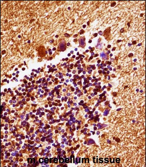 Mouse Map2k4 Antibody (C-term) (P31557)immunohistochemistry analysis in formalin fixed and paraffin embedded mouse cerebellum tissue followed by peroxidase conjugation of the secondary antibody and DAB staining.This data demonstrates the use of Mouse Map2k4 Antibody (C-term) for immunohistochemistry. Clinical relevance has not been evaluated. |