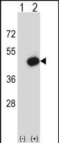 Western blot analysis of Pdk2 (arrow) using rabbit polyclonal Mouse Pdk2 Antibody (N-term) (Cat. #P31394). 293 cell lysates (2 ug/lane) either nontransfected (Lane 1) or transiently transfected (Lane 2) with the Pdk2 gene. |