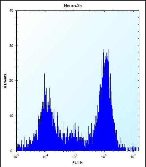 Mouse Prkca Antibody (N-term) (Cat. #P31434) flow cytometric analysis of Neuro-2a cells (right histogram) compared to a negative control cell (left histogram).FITC-conjugated donkey-anti-rabbit secondary antibodies were used for the analysis. |