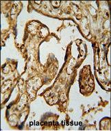 MPP1 Antibody (C-term) (Cat. #P30833) immunohistochemistry analysis in formalin fixed and paraffin embedded human placenta tissue followed by peroxidase conjugation of the secondary antibody and DAB staining. This data demonstrates the use of the MPP1 Antibody (C-term) for immunohistochemistry. Clinical relevance has not been evaluated. |