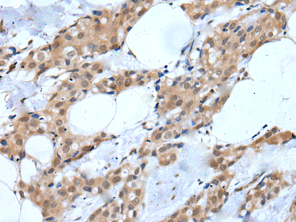 The image is immunohistochemistry of paraffin-embedded Human breast cancer tissue using P05917(MTA3 Antibody) at dilution 1/20. (Original magnification: ×200) |