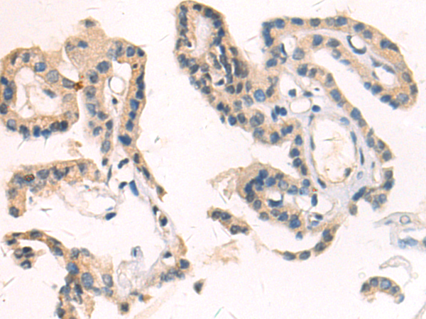 The image is immunohistochemistry of paraffin-embedded Human thyroid cancer tissue using P06931(MYBPC1 Antibody) at dilution 1/50. (Original magnification: ×200) |