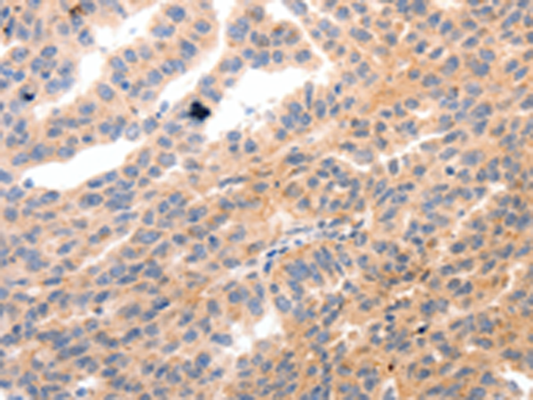 The image is immunohistochemistry of paraffin-embedded Human ovarian cancer tissue using P04126(MYL9 Antibody) at dilution 1/80. (Original magnification: ×200) |