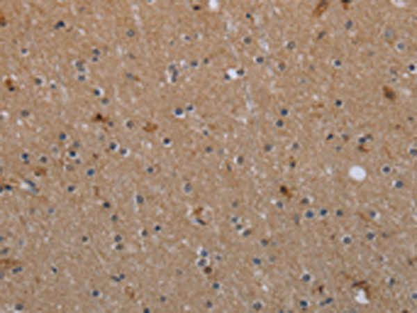 The image is immunohistochemistry of paraffin-embedded Human brain tissue using P05076(MYO7A Antibody) at dilution 1/30. (Original magnification: ×200) |