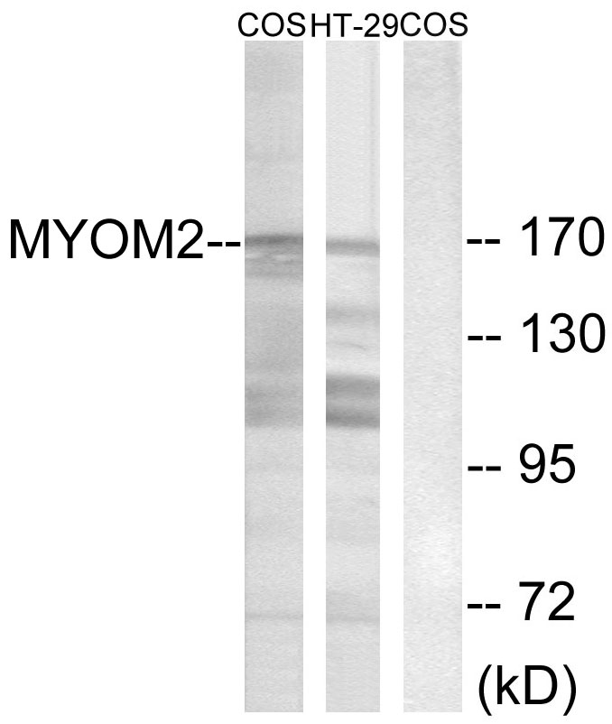 Western blot analysis of Myomesin 2 in COS7 and HT-29 lysates using MYOM2 antibody. The lane on the right is blocked with the synthesized peptide. |