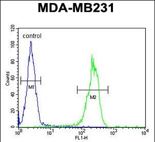 MYSM1 Antibody (N-term) (Cat. #AP10517a) flow cytometric analysis of MDA-MB231 cells (right histogram) compared to a negative control cell (left histogram).FITC-conjugated goat-anti-rabbit secondary antibodies were used for the analysis. |
