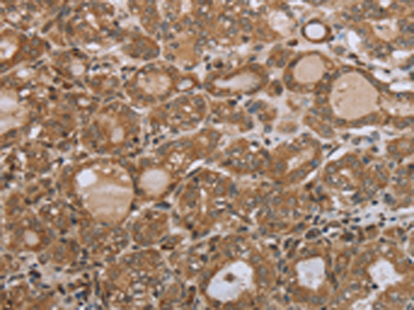The image is immunohistochemistry of paraffin-embedded Human thyroid cancer tissue using P05088(NDUFS2 Antibody) at dilution 1/35. (Original magnification: ×200) |