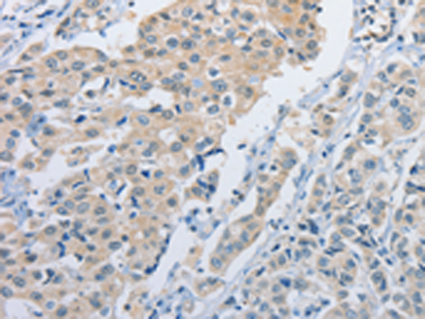 The image is immunohistochemistry of paraffin-embedded Human breast cancer tissue using P11518(NEK9 Antibody) at dilution 1/25. (Original magnification: ×200) |