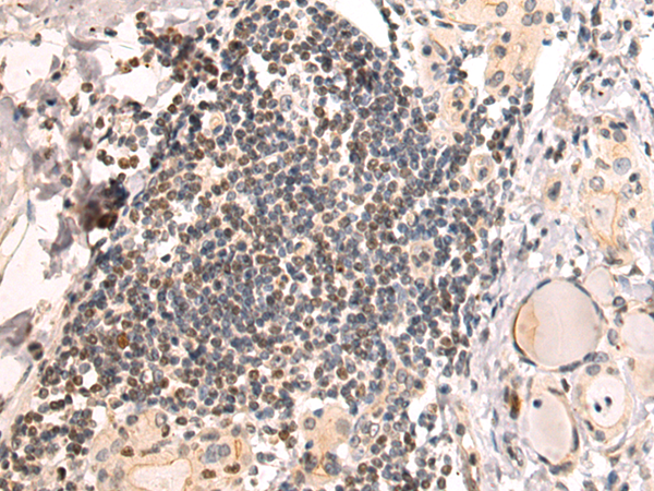The image is immunohistochemistry of paraffin-embedded Human thyroid cancer tissue using P11281(NEUROG1 Antibody) at dilution 1/50. (Original magnification: ×200) |