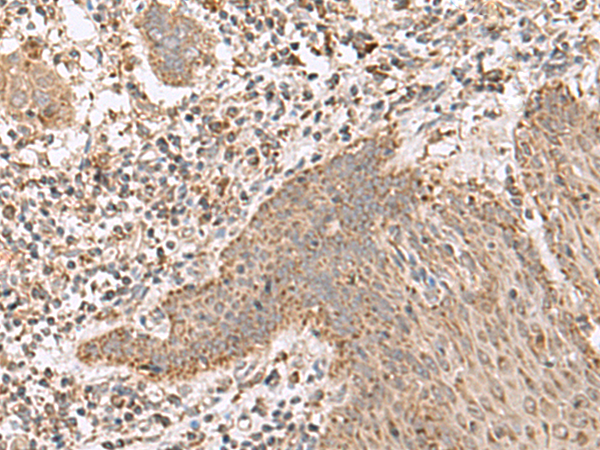 The image is immunohistochemistry of paraffin-embedded Human esophagus cancer tissue using P06482(NIPSNAP2 Antibody) at dilution 1/30. (Original magnification: ×200) |