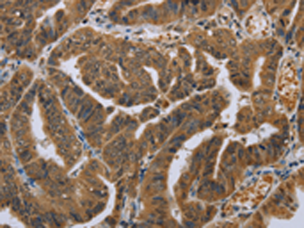 The image is immunohistochemistry of paraffin-embedded Human colon cancer tissue using P11985(NLRP10 Antibody) at dilution 1/45. (Original magnification: ×200) |