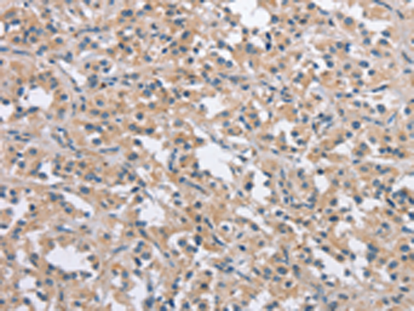 The image is immunohistochemistry of paraffin-embedded Human thyroid cancer tissue using P11688(NLRP3 Antibody) at dilution 1/25. (Original magnification: ×200) |