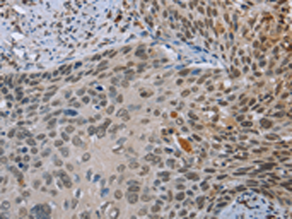 The image is immunohistochemistry of paraffin-embedded Human cervical cancer tissue using P05104(NMT1 Antibody) at dilution 1/45. (Original magnification: ×200) |
