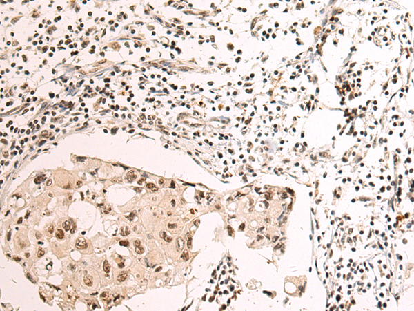 The image is immunohistochemistry of paraffin-embedded Human breast cancer tissue using P03552(NOP58 Antibody) at dilution 1/85. (Original magnification: ×200) |