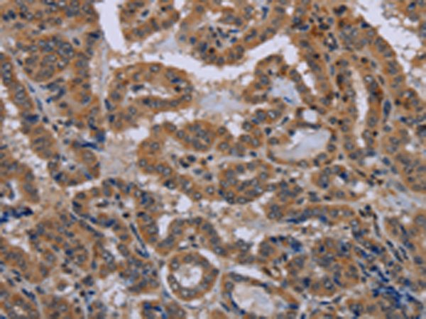 The image is immunohistochemistry of paraffin-embedded Human thyroid cancer tissue using P05110(NPHS2 Antibody) at dilution 1/40. (Original magnification: ×200) |