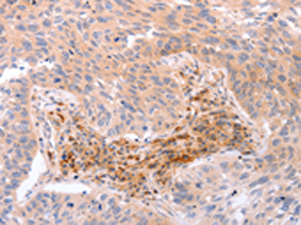 The image is immunohistochemistry of paraffin-embedded Human lung cancer tissue using P04002(NR3C1 Antibody) at dilution 1/25. (Original magnification: ×200) |