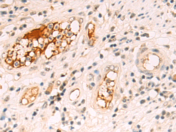 The image is immunohistochemistry of paraffin-embedded Human cervical cancer tissue using P11999(NRAS Antibody) at dilution 1/50. (Original magnification: ×200) |
