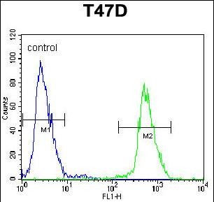 NUP210 Antibody (N-term) (Cat. #P30592) flow cytometric analysis of T47D cells (right histogram) compared to a negative control cell (left histogram).FITC-conjugated goat-anti-rabbit secondary antibodies were used for the analysis. |