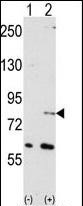 Western blot analysis of NUB1 (arrow) using NYREN18 Antibody (N-term) (Cat.#P30009). 293 cell lysates (2 ug/lane) either nontransfected (Lane 1) or transiently transfected with the NUB1 gene (Lane 2) (Origene Technologies). |