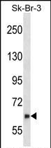 NYREN18 Antibody (E102) (Cat. #P30009) western blot analysis in SK-BR-3 cell line lysates (35ug/lane).This demonstrates the NYREN18 antibody detected the NYREN18 protein (arrow). |