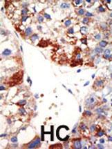Formalin-fixed and paraffin-embedded human cancer tissue reacted with the primary antibody, which was peroxidase-conjugated to the secondary antibody, followed by DAB staining. This data demonstrates the use of this antibody for immunohistochemistry; clinical relevance has not been evaluated. BC = breast carcinoma; HC = hepatocarcinoma. |
