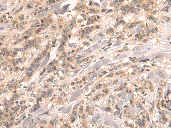 The image is immunohistochemistry of paraffin-embedded Human breast cancer tissue using P13771(OPRM1 Antibody) at dilution 1/50. (Original magnification: ×200) |