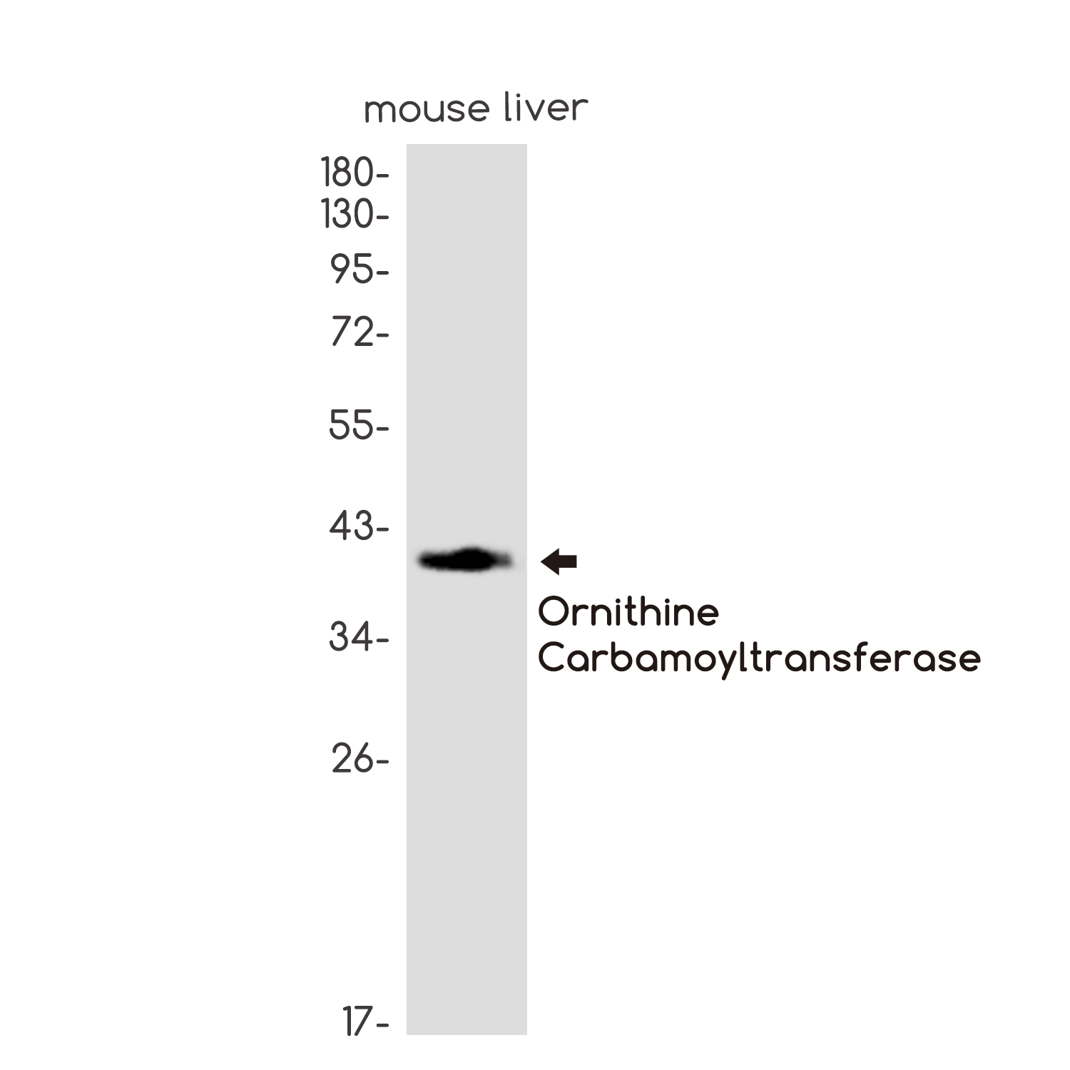 Western blot analysis of Ornithine Carbamoyltransferase/OTC in mouse liver lysates using Ornithine Carbamoyltransferase/OTC antibody. |