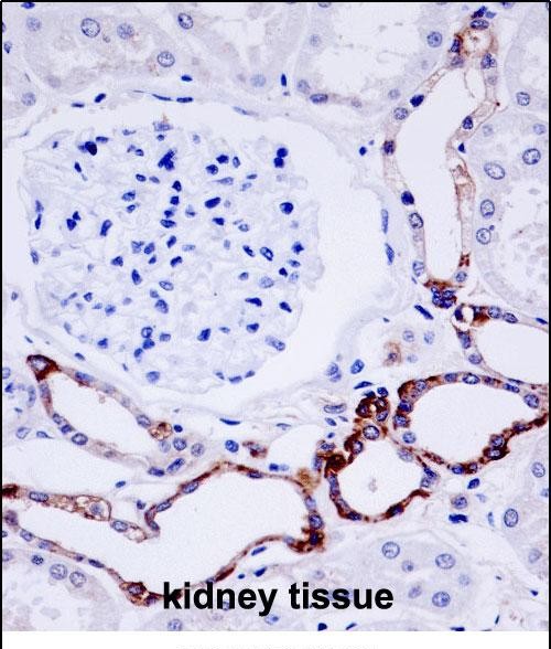 OTU7B Antibody (C-term) (P31435)immunohistochemistry analysis in formalin fixed and paraffin embedded human kidney tissue followed by peroxidase conjugation of the secondary antibody and DAB staining.This data demonstrates the use of OTU7B Antibody (C-term) for immunohistochemistry. Clinical relevance has not been evaluated. |